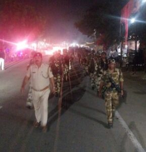 है। मंगलवार को देर शाम जयश्री अड्डा से काराकाट बाजार तक अर्धसैनिक बल सीआईएसएफ के जवानों ने फ्लैग मार्च किया।इसमें काफी केवल सीआईएसएफ के सौ जवान शामिल थे। थानाध्यक्ष विवेक कुमार के नेतृत्व में जवानों ने फ्लैग मार्च किया।इस दौरान लोगों से शांति शांति बनाए रखने में सहयोग करने व निर्भीक हो निष्पक्ष मतदान करने की अपील भी की गई। थानाध्यक्ष ने कहा कि चुनाव के दौरान यदि कोई डराने व धमकाने की चेष्टा करे तो इसकी सूचना तत्काल पुलिस या फिर प्रशासनिक अधिकारी को दें।एसआई मिथिलेश कुमार के अनुसार फ्लैग मार्च का उद्देश्य ही है क्षेत्र में शांति व्यवस्था कायम रखना और असमाजिक तत्वों पर पैनी नजर रखते हुए मतदाताओं में भयमुक्त माहौल का भरोसा दिलाना।ताकि समाज के कमजोर मतदाता भी निर्भीक मतदान कर सके। बाजार वासियों की मानें तो फ्लैग मार्च के लिए जवानों को बाजार में आते ही नशेड़ी व असामाजिक तत्व के लोग अचानक गायब हो गए। गत सोमवार की रात बाजार के एक आभूषण दुकान में हुई चोरी की जगह स्थानीय पुलिस के साथ सुरक्षा बल को चक्कर लगाने से लोग सहमे हुए थे।
